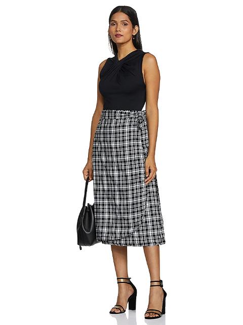 Charcoal Grey and Black checked flared skirt, has an elasticated waistband with zip closure, flared hem and a front slit. This skirt looks incredibly adorable. Pair it with a top and boots when you are out on a picnic.